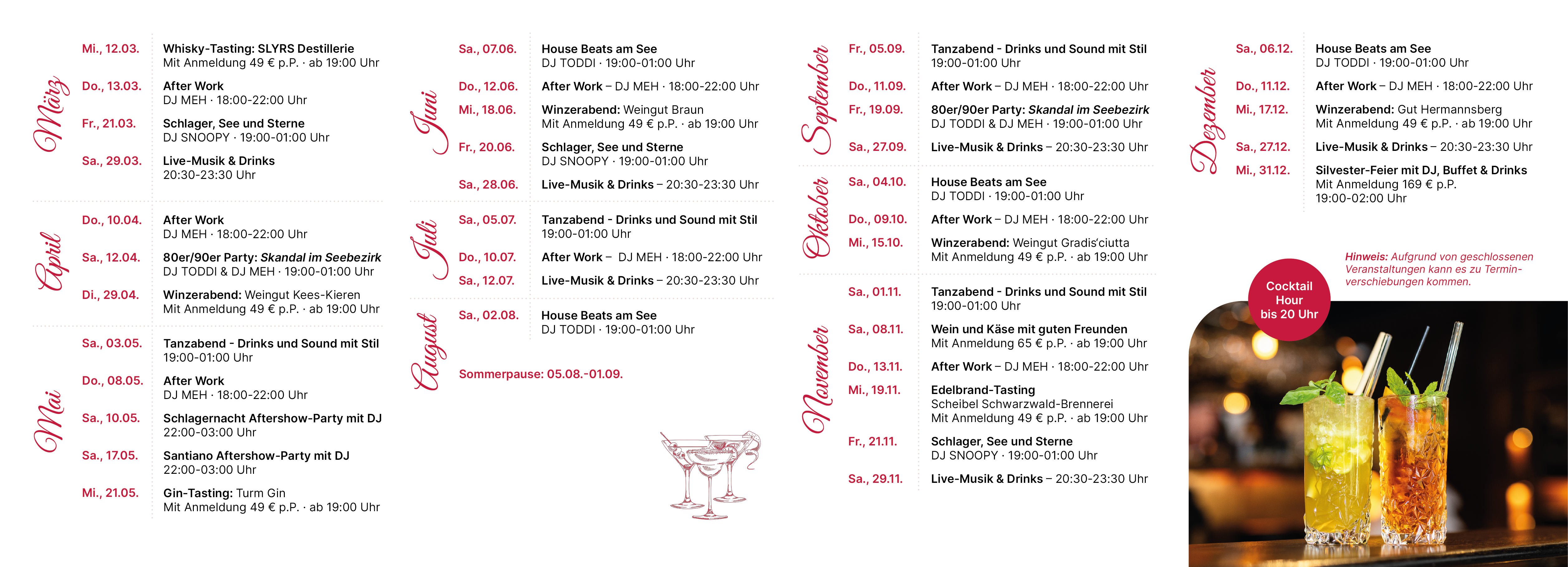 Aufgrund von geschlossenen Gesellschaften könnte es zu Verschiebungen bei einzelnen Events kommen. Wir danken für Ihr Verständnis und freuen uns auf Ihren Besuch.